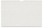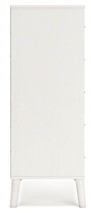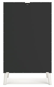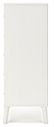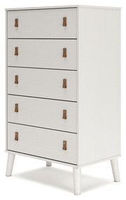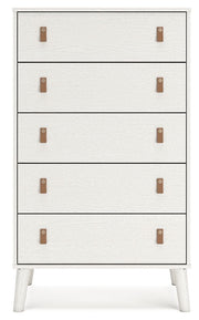 Dare to take minimalism to the max. This chest of drawers has an air of sleek simplicity thanks to its painted finish with subtle replicated wood grain. Magnificently mod splay legs are a compelling complement to the streamlined design. And with two sets of faux leather drawer pulls that allow you to customize the chest to suit your space, there's no doubt about it: This contemporary piece is sure to become a classic.