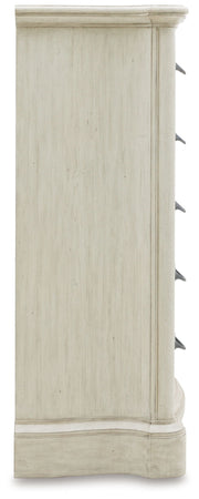 Add a touch of romance to your bedroom with this chest of drawers. Its antiqued white painted finish and serpentine-shaped silhouette details are the picture of easy elegance. Five spacious drawers offer ample storage space, while custom-designed bar pulls add originality.