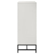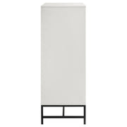 Create ample storage with the compact footprint of a modern four-drawer chest. Its roomy drawers are ideal for clothing, linens, and accessories, helping to keep your personal space tidy and organized. A white finish complements straight, clean lines, while black hardware adds contrast and depth. complementary metal base in black adds light, airy ambiance. Use the top for decor like photos, or add a jewelry box for a personal touch.