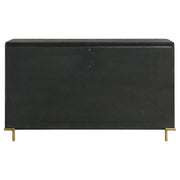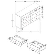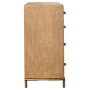 Create a focal wall and ample storage to your bedroom with this mid-century modern eight-drawer dresser, designed with a wire-brushed sand wash finished wood frame. Aged brass round knobs and slender legs offer a charming, metallic touch. Softly rounded corner edges and felt-lined top drawers present a finishing touch and thoughtful details.
