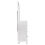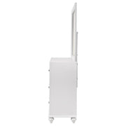 Step into a world where glitz meets function with this dresser and mirror set, designed to add a dash of glamour to your bedroom. The dresser, with its bold black frame and glittery metallic drawer fronts, features three smaller drawers atop four larger ones, providing ample organization for your attire. Faceted crystal hardware enhances its sparkle, making it ideal for spaces in need of some shine. The sleek, modern mirror, with a bold black finish and embossed frame, complements the dresser, offering a streamlined look that's perfect above the dresser or as a standalone piece on the wall.