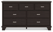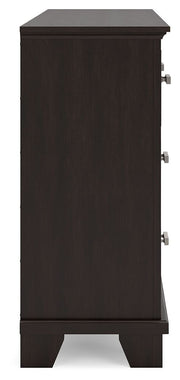 Feast your eyes on this richly versatile dresser. Its traditional-inspired dark brown finish effortlessly blends with contemporary bright nickel-tone pulls to create a stunning look that's not too stuffy or too trendy. Spacious drawers offer plenty of storage for your wardrobe and spare bed linens.