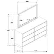 From a wide top to roomy drawers for easy storage, this modern six-drawer dresser is the perfect accompaniment in your bedroom. A warm wood grain finish is handsome and restrained, perfect for an understated, elegant ensemble. The dresser features two top drawers with dark brown felt lining, offering a perfect spot for delicate items and personal accessories. Fingertip pulls complete the look with a clean, fresh presentation. The dresser stands on wide legs, adding airy ambiance in your modern bedroom.