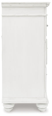 Give your retreat vintage charm and valuable drawer storage with this dresser. In a beautifully distressed whitewash finish, you'll love putting it all away in casual style. Seven full-sized drawers and two accessory top drawers will easily accommodate your needs. Generously scaled moulding from top to bottom, along with bun feet and drawer handles with a transitional aesthetic, give this dresser character—evoking the feel of a quaint cottage escape.