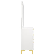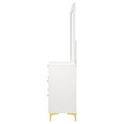 Elegance meets functionality in the Dresser and Mirror set, with its modern glam design that maximizes your space while offering ample storage. The sleek dresser's boxy black frame and six spacious drawers provide a bold and organized focal point in your bedroom. Each drawer, accented with slender pull handles, contrasts beautifully with the finish, while the bracket legs echo the metallic theme. The accompanying mirror's tall, clean-lined frame enhances the setup, creating an ideal vanity space that blends seamlessly with any color palette. This set is not just a statement piece; it's a testament to sophisticated design that serves everyday needs with style.
