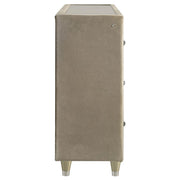 Infuse your space with cozy glamour in this eight-drawer flame box dresser, richly upholstered in velvet. A built-in LED flame visualizer is framed by clear tempered glass and acrylic details, while crystal knobs and quilted velvet drawers shine with elegance. LED case lighting and a wireless remote enhance function, while brown felt-lined top drawers, dovetail joints, and heavy-duty glides provide strength and finesse atop acrylic legs.
