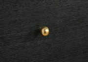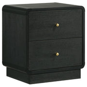 Put finishing touches on a sophisticated bedroom ensemble with this modern two-drawer nightstand. Offering roomy storage for overnight essentials, it features a rich black finish over melamine surfaces that are designed for longevity. The nightstand features a rounded corner case, creating a softened effect in a luxurious space. Drawer fronts are complemented with brass-finished ball knobs, adding the perfect hint of warmth and sophistication. A recessed base completes the look, while metal drawer glides provide for smooth, seamless operation.