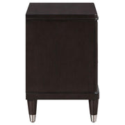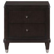 Accentuate bedroom decor with the chic look and impressive functionality of a modern two-drawer nightstand. Its sleek look is accentuated with delicate trim and petite round knobs on each drawer. A dark brown finish ensures a versatile palette, complementing in a variety of bedroom settings to create a warm, soothing ambiance. The top drawer includes felt lining and the bottom drawer cedar, adding protection to your bedside storage. Tapering feet complete the look with metallic finish caps, offering a touch of contrast and depth at your bedside.