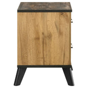 Complete your bedroom ensemble with this stylish nightstand, perfectly blending mid-century modern design with a rustic touch. The weathered brown and natural pine finish, accented by matte black finished metal pull handles, adds sophistication and charm. Featuring English dovetail drawer joinery and center metal drawer glides, this nightstand offers smooth functionality and ample storage space. The 3D paper veneer gives it a textured wood grain feel, making it both durable and visually appealing.