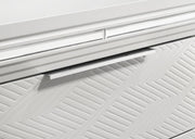 Complete your bedroom ensemble with this elegant 2-drawer nightstand, designed with a modern Italian aesthetic. The white finish, accented with mirror framing and polished chrome metal hardware, creates a striking look. Featuring picture framed recessed panels with an embossed herringbone graphic pattern, this nightstand offers both style and functionality. The top drawer includes cord management access, making it perfect for your rechargeable devices. Crafted from rubberwood, MDF, and mirror, this nightstand is a luxurious addition to any bedroom.