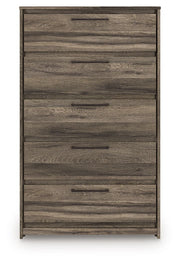 Casually cool style and lots of storage go hand in hand with this chest of drawers. A weathered brown finish over replicated oak grain creates an easygoing vibe, setting the scene in your restful retreat. Clean lines and modern handles provide a fuss-free look. And the chest's five roomy drawers give you plenty of space for stowing away clothes and more.