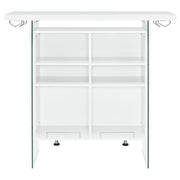 Elevate a multipurpose living room with this modern bar unit. a neutral finish, accented with polished chrome metal accents offers a striking design contrast. supported and flanked by clear tempered glass side panels, this bar unit boasts ultra-modern elements as well for a dramatic feel. compact yet highly functional, this bar unit also features ample storage space with six built-in open shelves for storing bottles, serving pieces and other mixologist must-haves. tucked beneath the bartop along each side is a stemware rack for wine glasses and more.