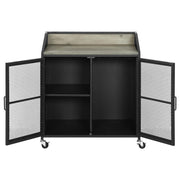 This industrial style wine cabinet offers ample space for keeping favorite vintages, corkscrews and accessories. Designed with a sandy black powder coated finish over a durable steel frame, this functional wine cabinet can be placed in a modern farmhouse home or contemporary loft apartment with limited space. Set on rolling casters, this wine cabinet goes wherever you need to entertain in the home. A gray wash top surface invites decor and seasonal glassware to proudly display. In addition, a two-door cabinet below with see-through wire panels keep stemware and other wine serving essentials tucked away neatly.