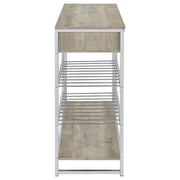 Your entertaining needs are filled with a sense of casual style and supreme organization as this wine cabinet provides space and configuration for a casual space. Make serving a breeze with a cabinet featuring gray finish wood products construction of an upper two-drawer cabinet and matching lower shelf. Minimalist metal framing adds a great optical benefit, with two slat shelves that accommodate dishware and stemware. Drawers open easily to make space for implements. This all-in-one bar cabinet offers a fresh, clean look and lots of convenience to organize an entertainment regimen.