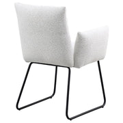 Elevate your dining experience with this modern dining chair, designed for both comfort and style. Upholstered in soft fabric, this chair provides a cozy seat for everyday dining or special gatherings. The chair features a contemporary design with gently curved armrests and a sleek, powder-coated black metal sled base for a minimalist yet bold look. Its clean lines and subtle elegance make it a perfect addition to any modern dining room or kitchen space.