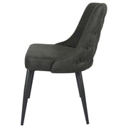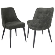 A retro-inspired twist to a traditional silhouette, this pair of side chairs is ideal for transitional dining spaces. With a comfy cushioned seat wrapped in a soft fabric upholstery, each chair features offers long-lasting comfort and relaxation. An elegantly curved backrest offers classic button-tufted exterior and a smooth interior, along with sloping arms. Resting on slim tapered legs that have a subtle flare, these chairs lend a mid-century vibe. Compact by design, slide these chairs up to a four-top table in a small dining space.