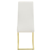 This dining chair brings a sleek, modern aesthetic to any dining space. Its cantilever design offers a floating effect, supported by sturdy gold electroplated metal legs for a luxurious touch. Upholstered in smooth white faux leather, the high backrest and padded seat provide superior comfort and style. The gently contoured shape enhances ergonomic support, making this chair a perfect choice for contemporary interiors. Designed for both elegance and durability, it’s a stunning addition to any dining setting.