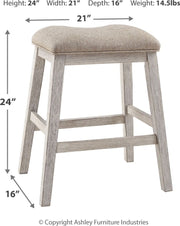 Made with Acacia veneers and select rubberwood solids, in a grayish white finish with rub through effect for a time worn appearance. Top is finished in a medium toned brown color with a planked effect with saw kerf distressing. Chair has a classic casual design with a tall ladder back look with simple features. Seat is covered in a light colored fabric cover. D394-32 pairs with 4 counter height stools. Built-in 8-bottle wine rack and open shelves. D394-024 cushioned saddle seat with a light textural polyester fabric. D394-113 barstool dimensions: 21"W x16"D x 24"H. D394-223 barstool dimensions: 16"W x 14" x 24"H. Multi functional dining table features two convenient side drawers and a storage bin on each end for maximum use of space. Storage on the ends for maximum use of space. Finished in a trend right gray washed color with contrasting light oak colored top. Solid wood chair frames with cushioned seat in light gray woven polyester fabric. Piano style bench with under seat storage bin. D394-423 counter height dining set includes 6 stools and counter height leg table. Two-tone finish with a brown wood tone top contrasted with a grayish white with rubbed through effects.