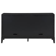 Captivating with a touch of Art Deco style, this black wood sideboard is a functional and fashionable addition to your dining room or living space. A great choice for expanding dining room storage, this chic sideboard is built of rubberwoods and wood products, sturdy and solid. A dramatic black finish embellishes linear groove designs on its door fronts and drawer fronts, adding a textural element to impart dimensionality. Find space for your serve ware and implements in a pair of top drawers and in shelving behind four doors. Drawers feature English dovetail construction on metal extension glides, and ornate metal hardware completes an artisanal look.