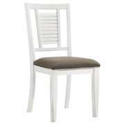 Gather around this modern farmhouse dining set, where each meal becomes a cherished moment under the warmth of the brushed brown tabletop. As the centerpiece of your eat-in kitchen, it exudes casual elegance with its classic rectangular table and the artful contrast of its white tapering legs. The coordinated chairs echo this design, their louvered panel backs and plush, dark brown seats inviting you to linger over your morning coffee or a leisurely dinner. Together, they craft a dining space that feels both open and intimate, where the clean lines meet cozy comfort, perfect for creating memories with loved ones.