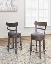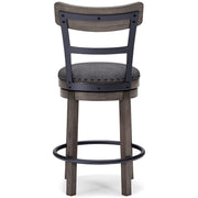 Bring a relaxed yet refined sense of good taste to a space with this upholstered swivel bar stool. The sturdy wood frame with contoured backrest is beautified with an antiqued gray wash finish that’s easy on the eyes. Rest assured, this bar stool caters to your comfort with a cushioned seat with gray textured fabric accentuated with nailhead trim. Sensible swivel design keeps you in the flow of conversation.