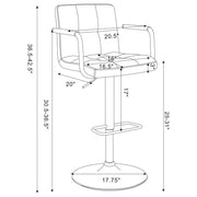 With an air of contemporary California style, this bar stool adds a cool, updated vibe to a wet bar or living room lounge. Its cushy, padded seat is upholstered in soft, leather-like material with stylish tufting and a smooth, luxurious texture. Its wide, round base and ergonomic arm rests are designed with sleek, graceful curves. A small yet sturdy foot pedestal allows for extra comfort as you sit back and relax with your favorite beverage. Conveniently height adjustable, this stylish stool adds effortless glamour wherever you decide to place it.