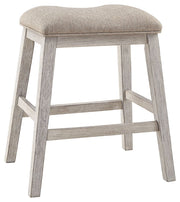 This upholstered stool invites you to raise the bar on small space living. An inspired choice for coastal chic or modern farmhouse settings, this comfortably cushioned stool sports a grayish white finish with rub-through effect for timeworn appeal.