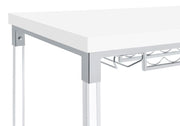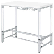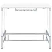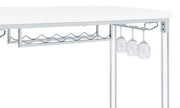 Create the ideal spot to share a bottle of wine with friends with a contemporary bar table. Perfect for two to four, it boasts a crisp, streamlined silhouette with an elevated tabletop in a bright white finish. The base features a silver finish and trestle details. Acrylic legs add a sense of light, airy ambiance, perfect for a compact nook or dining room. The table includes a built-in six-bottle wine rack and two stemware racks that make pouring a glass of your favorite vintage simple and easy.