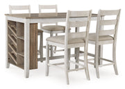 This counter height table with storage invites you to raise the bar on small space living. An inspired choice for coastal chic or modern farmhouse settings, this clean-lined, simply striking table doubles the charm with a brown tone top with plank effect, paired with a grayish white base with rub through effect for timeworn appeal. Built-in 8-bottle wine rack and pair of open shelves make the most of every inch of space.