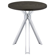 Gather around this sleek rustic-inspired contemporary bar table to wet your whistle. Designed with a wonderful contrast of woodsy and metallic elements, this beautiful modern bar table takes a masculine approach fit for game nights and beyond. Stand around with a drink in hand or coordinate with the bar stool of your choosing, talking over the charming, round, dark oak table top. Edgy polished chrome legs present an hourglass-like pedestal base for a dramatic, yet elegant touch. Set this inviting bar table in a casual entertainment room for a metallic accent and barrel-like element of surprise.