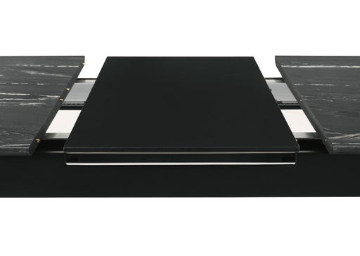 View full detailsThe luxurious look of faux marble creates a glam sensibility for a modern dining table. The black marble look of the tabletop complements a sleek b...
