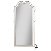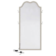 Chic couture style is a featured element of a lighted LED floor mirror well suited to fashionable living spaces. The Evangeline floor mirror offers a shapely silhouette with an arch top and rectangular profile. Its pine wood frame offers a silver oak finish, delightful and decadent. Side hangers add convenience, and LED lighting on its mirrored section is both mood-inducing and functional. A floor switch operates this glam-inspired mirror.