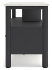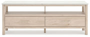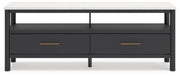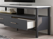 Imagine a TV stand that adds sophisticated and minimal boho style to your home with a stylish storage solution. This stand does just that. Its sleek design and replicated marble top create an upscale ambiance that's perfect for displaying your television and organizing your space.