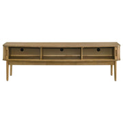 With graceful curves and rich texture, this mid-century inspired media console becomes an understated centerpiece. Reeded sliding doors ripple gently across the front, adding quiet rhythm to its softened silhouette. The weathered natural finish warms the room like sunlight through wood grain, while open shelving within offers thoughtful space for your favorite pieces. Crafted from solid rubberwood and engineered wood, and perched on tapered legs, it brings both elegance and ease to any curated living space.