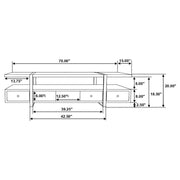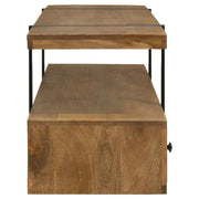 Elevate your entertainment space with this masterfully designed TV stand, perfectly suited for televisions up to 75". Constructed from robust Mango wood and accentuated with metal, it features a distinctive floating shelf, supported by sleek gunmetal-finished legs. This stand seamlessly blends durability with modern aesthetics, offering both function and flair for your living room.