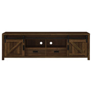 Wood-like finishes and country-inspired elements create this rustic style tv console. keep entertainment consoles, a stereo and more tucked neatly within two open shelves toward the center. disguised by sliding barn doors mounted on black hardware that lend an industrial touch, this television console also stores away entire collections of movies, games and music. with its long rectangular design and clean square edges, this console furniture piece makes an excellent addition to entertainment rooms and living rooms. this tv console makes a charming, versatile piece for your entire entertainment system setup.