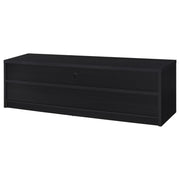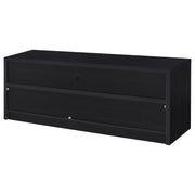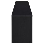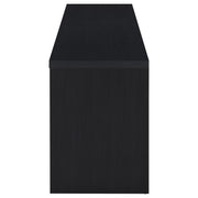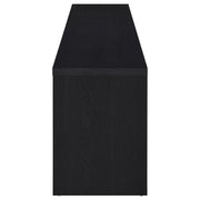 Upgrade your entertainment space with this black TV stand, crafted from engineered wood with a paper laminate veneer for durability and a sleek finish. The clean lines and modern design include open shelves for electronics, a wire management hole to reduce clutter, and three concealed drawers for organized storage. Perfect for flat-screen TVs, this media console combines style and functionality for any contemporary setup.