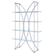 The ultimate in contemporary design rests in this eye-catching bookcase. Modern architecture meets art in a compelling silhouette blending arc-shaped and linear steel frames with clear tempered glass shelves. Four tiers offer ample space for displaying books, decor, and potted greenery. A fresh chrome finish adds luster to a tastefully designed contemporary space. Energize a modern room with a subtle yet tasteful bookcase.
