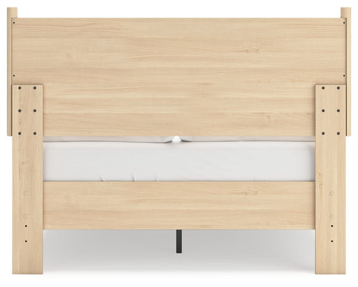 View full detailsClean-lined and contemporary—but far from stark—this panel bed is a fresh style awakening. Pairing a light finish with replicated oak grain and tex...