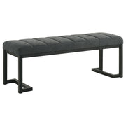 Textured upholstery play perfectly with the modern silhouette of a backless accent bench. Its deep finish frame is constructed in metal for excellent durability, with a bracket inspired silhouette that emphasizes its contemporary design credentials. Thes eat is backless, with channel tufting that adds depth to plush foam cushioning. Upholstery is softly textured, perfect for a cozy feel in a modern living area or bedroom. Its neutral coloration is perfect for a variety of surrounding decor motifs.