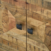Bold in scale and rich in character, this accent cabinet makes a dramatic backdrop for entertaining. Its square patterned door fronts boast a saw mark effect, while black accents lend industrial appeal to the design. Radiating an aura of welcoming warmth, this piece fills your home with effortless elegance.
