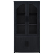 A dramatic silhouette and graceful arches come together in this striking display cabinet, where elegance meets purpose. Tall framed glass doors open to reveal a softly illuminated stage, casting warm light across treasured pieces. Below, concealed storage offers hidden utility behind panel doors, each compartment thoughtfully fitted with adjustable shelves. Cloaked in a deep black woodgrain, this cabinet brings quiet drama and timeless refinement to any curated space.