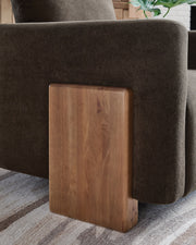 Cozy comfort meets modern design. This accent chair invites you to sink into its plush chocolate brown fabric. Substantial solid wood block legs with a natural finish infuse contemporary flair into your living area, bedroom or home office. And yay, it arrives fully assembled.