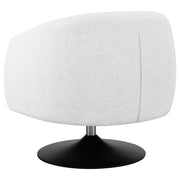 Elevate your seating area with this stylish swivel accent chair that blends modern sophistication with retro charm. Wrapped in soft beige boucle fabric, it offers a tactile texture and inviting comfort. The barrel-back silhouette features a tailored seat and gently curved arms for a clean, contemporary look. Supported by a matte black pedestal base, the chair rotates a full 360 degrees for effortless movement. Perfect for a living room or reading nook, it combines comfort, versatility, and modern flair.