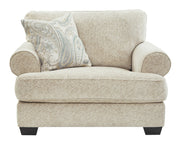This oversized chair strikes a beautiful balance between classic and current. Its traditional elements include t-cushion seating and setback roll arms, angled for modern flair. A jacquard paisley pillow makes a muted, mellow complement to the chair’s casual textured chenille upholstery. And the choice of sandstone beige is a light and lovely style awakening.