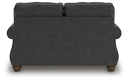Everyone can have the best seat in the house with this loveseat. Its nailhead trim puts the finishing touches on the traditional roll arms you love. Comfy, durable cushions—wrapped in a rustic yet sophisticated faux leather—keep you feeling relaxed. Chenille pillows in a distressed motif pattern add another layer of comfort. And the loveseat's turned legs show that style and quality flow from top to bottom.