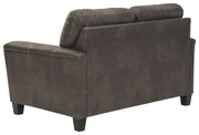 If you love the cool look of leather but long for the warm feel of fabric, you can take comfort in this loveseat. Wrapped in a fabulous faux leather with a weathered hue and hint of pebbly texture to resemble the real deal, this decidedly modern loveseat proves less is more. Elements include angled side profiling and track armrests wrapped with a layer of pillowy softness for that little something extra. Prominent jumbo stitching and clean-lined divided back styling lend fashion-forward flair.