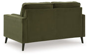 This loveseat strikes the perfect balance between elevated and eclectic. Contemporary lines and a richly hued velvet upholstery keep things chic. Design details like button tufting and splay legs add mod flair. It’s sure to keep your living room luxuriously on trend—at a price that won’t break the bank.