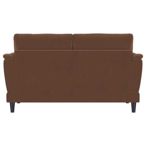 View full detailsModern lines and plush comfort come together in this upholstered loveseat, designed for relaxed refinement. A engineered wood frame in a rich coffe...
