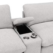 This three-seat home theater seating set combines modern convenience with plush comfort. Each power recliner offers smooth adjustability, while two center consoles feature lift-top storage and dual stainless steel cup holders. Upholstered in soft fabric, the generously padded cushions and pillow-top armrests enhance relaxation. Built for durability and long-lasting support, this seating arrangement is perfect for creating a cozy entertainment space.